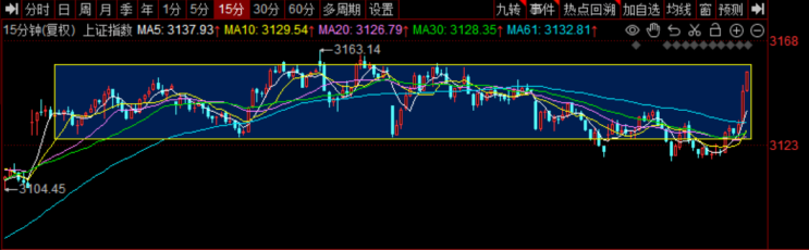 这是时间面上的压力,同期也需要禁锢的是,在地产利好计谋密集落地后,当今存在利好松手的压力。短期而言,借着利好,上证指数可能苟且15分钟K线图的荡漾区间,但上方3220点近邻的压力位并不远,可能不是短时辰就能消化的。
