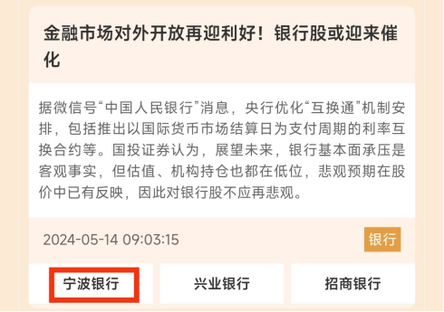 火线快评团队连忙跟进银行板块的投资逻辑及策划个股,并在次日(5月14日)盘前发布了资讯,其中,宁波银行在资讯发布后的5日内最高潮幅为6.5%。
