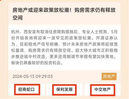火线快评团队第一技术梳理了房地产板块的投资逻辑及策划个股,并在5月13日盘前发布了资讯,其中提到的招商蛇口、保利发展和中交地产,在资讯发布后的5日内最高潮幅辞别达到了17.73%、17.65%和16.63%,涨幅至极喜东谈主。