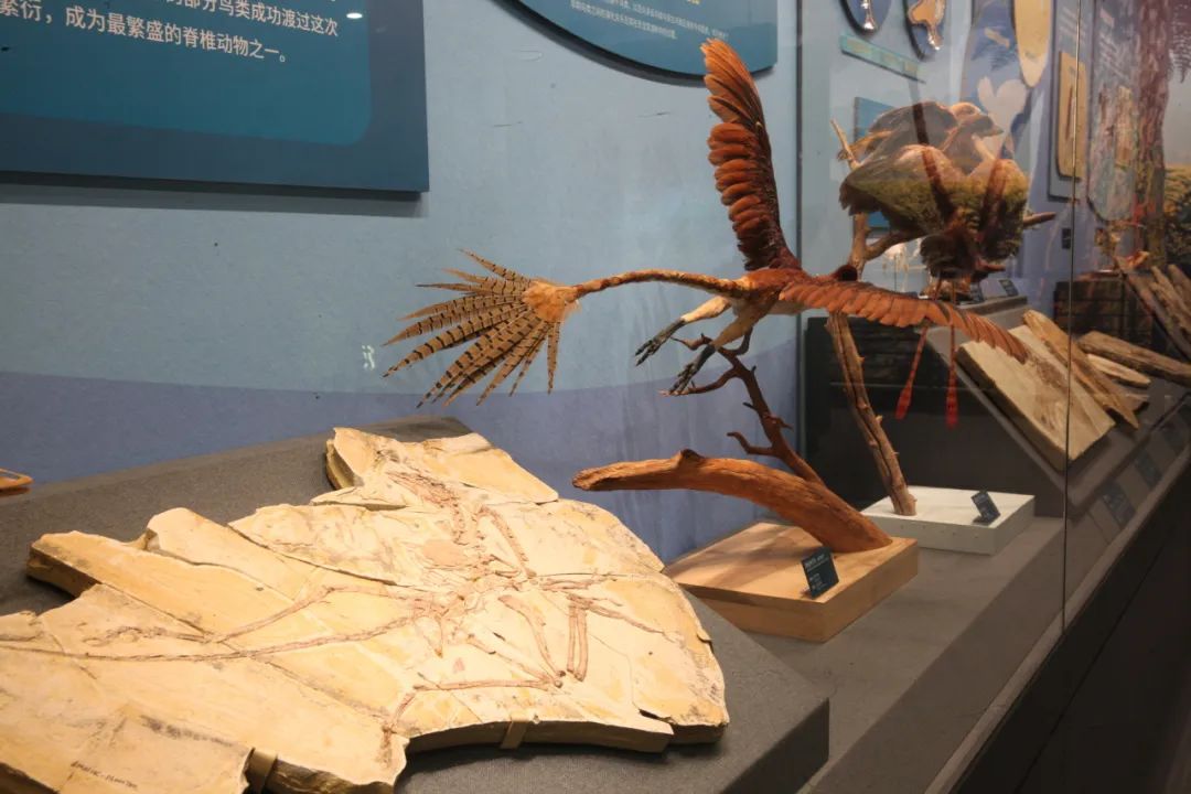 “展翅翱翔”单位先容演化史上“从龙到鸟”的进击经由,除了原始热河鸟的化石标本,还同期罗列了一件具有羽毛的回答模子,不错看到这种原始鸟类长着骨质长尾。